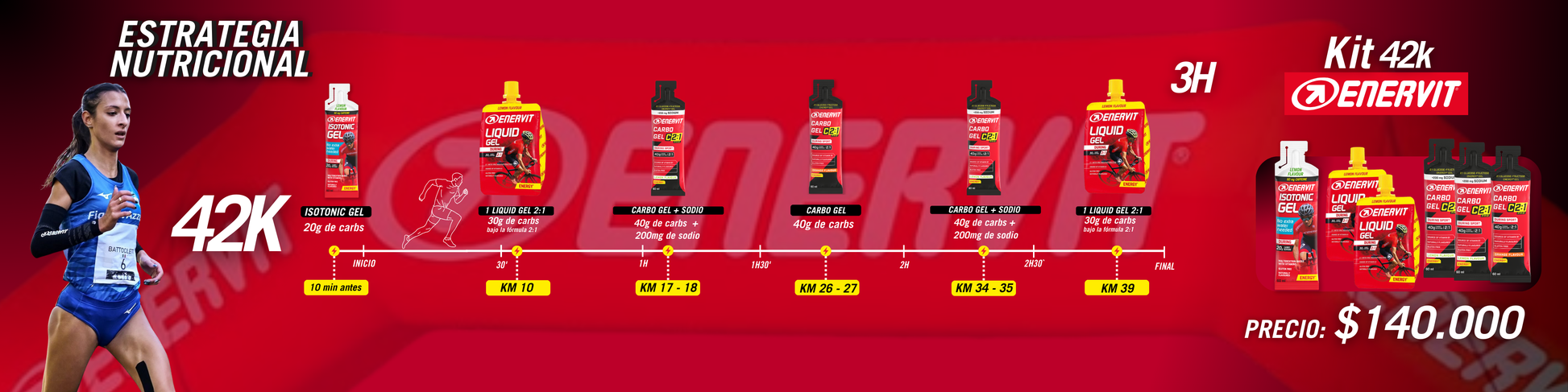 Estrategia nutricional alta en carbohidratos, desarrollada específicamente para la distancia de 42K, y un tiempo estimado de 3h