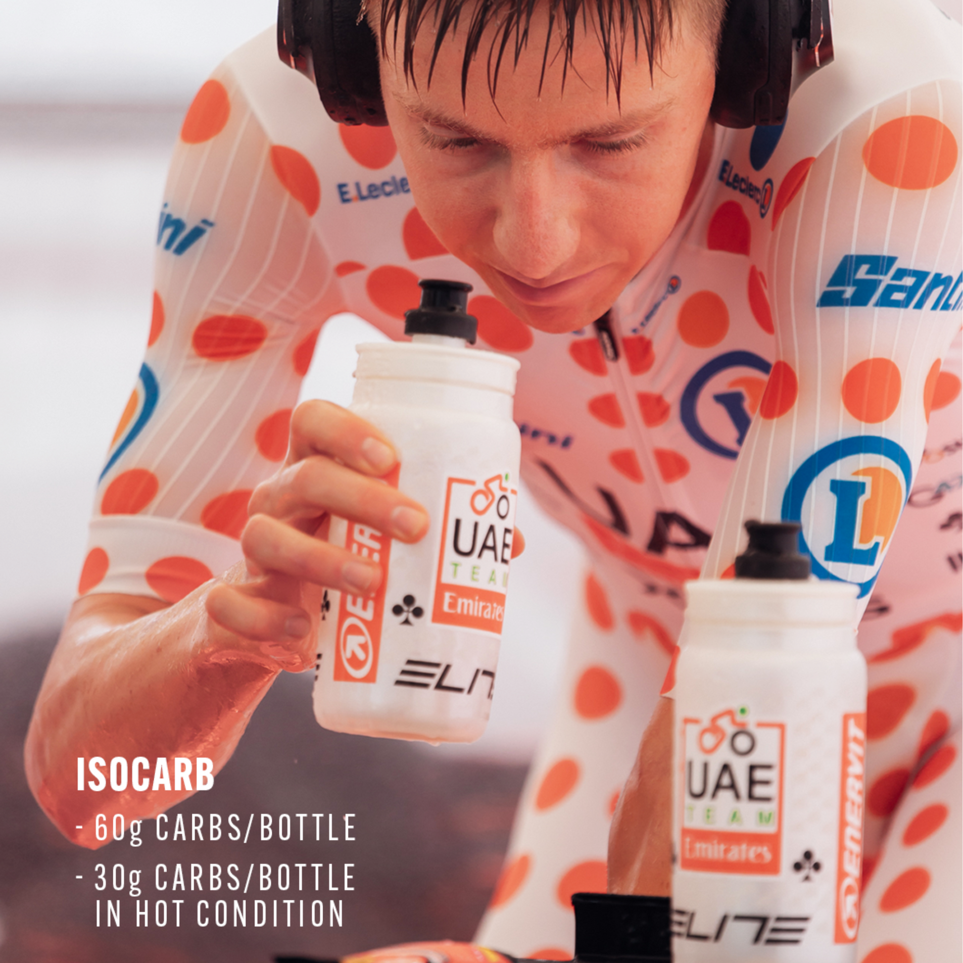 - 3x ISOCARB C2:1PRO - (Carbs: 60 g). '' La bebida de Pogačar'' - Carbohidratos 100% líquidos para tomar en agua durante todo el recorrido. Su fórmula Isotónica, y aporte en sodio, te permitirán asimilar una alta cantidad de CH sin necesitar agua adicional, y de la forma más amigable para el estómago. Energía + Hidratación